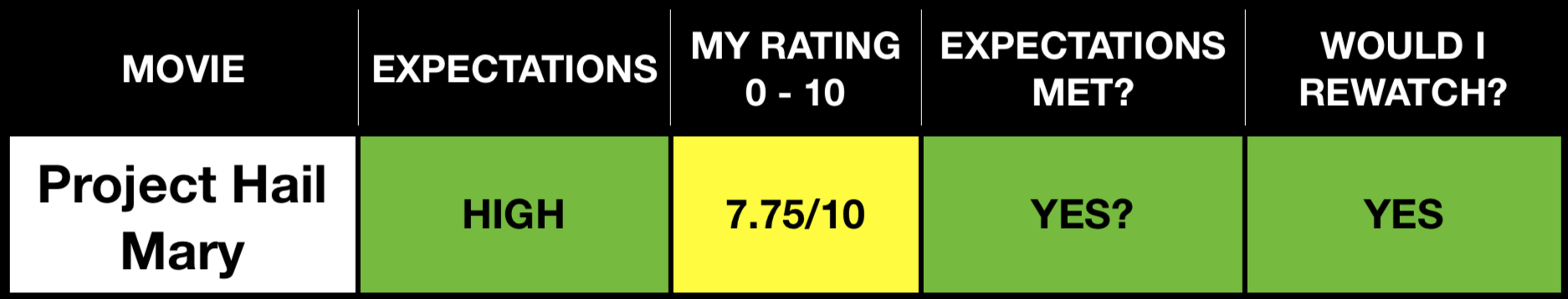 A confession, this is not the first time I have seen this. 8 days ago I saw an early public screening and tried to review it then. Problem was, I was burnt out, I had been for a couple of weeks. My eyes were sore, my face hurt, my muscles ached, my brain was mush, I was exhausted. Anyway I had already watched How To Make A Killing that day and was ready to sleep going into Project Hail Mary. For the runtime it alleviated my symptoms a bit but I was not in a great state to watch let alone review a film. I rated it 7.75/10. I wasn’t amazed with the film bit I did enjoy it a lot. It’s the same way I feel about The Martian. There is so much heart in this film it was so nice to see. But it did not wow me like I thought it would, and I really wanted it too. So here I am going to see it again after a week of resting to see if it makes a different impression.
