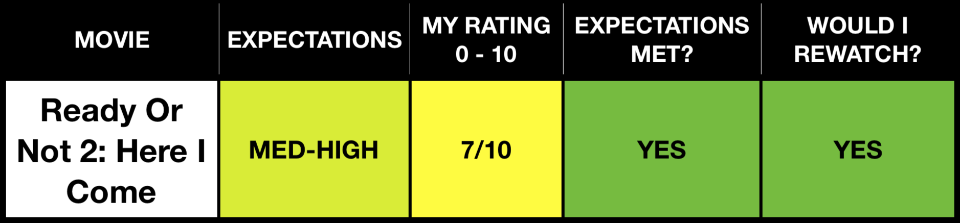 I had literally just walked out of seeing I Swear at the cinema straight into watching Ready Or Not 2. I loved I Swear and think it maybe the best film I have seen in 2026 so that was a hard act to follow. The fact that I still gave Ready Or Not 2 a 7/10 says a lot about that.